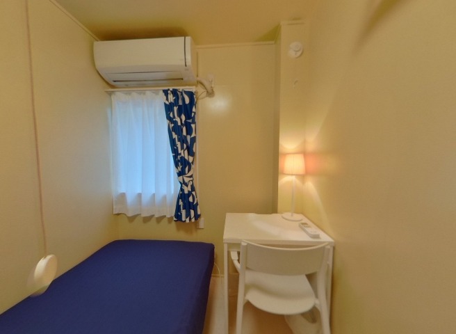 居室内にベッド、机、椅子、ランプ、カーテン設置済みシェアハウス♪